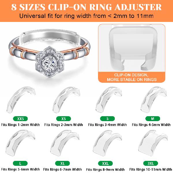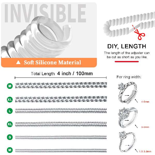 1 Resize Your Ring & Solve Looseness Easily - A newly upgraded 14-pack ring sizers for loose rings set, suitable for rings ranging from 1mm to 11mm wide. Ideal for both women's delicate rings and men's wider bands, it allows you to resize your ring without professional adjustments 2 Soft Silicone Material, Comfortable & Safe - Made of soft silicone, these ring adjuster for loose rings women are gentle on the skin and ideal for sensitive skin. Lightweight and comfortable, they add no extra weight, cause no damage to your ring, and are waterproof and easy to clean 3 Invisible Design, Stylish & Discreet - The transparent ring sizers design blends seamlessly with your ring, making it virtually invisible. It maintains the beauty and style of your ring while ensuring a comfortable and secure fit 4 Two Styles, Fits Most Rings - Includes 8 ring spacer for loose rings women and 6 ring spiral size adjuster, offering a versatile solution for most ring types, including wedding bands and fashion rings. Easily wraps around the inside of any ring for a snug fit 5 Easy to Use, DIY at Home - No need for complicated tools or expensive resizing services. Simply adjust your ring at home without damaging it. If your finger size changes, just remove the ring size adjuster for loose rings to restore the ring to its original size—convenient and hassle-free!